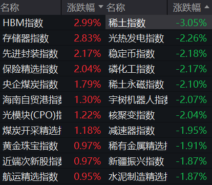 存储芯片概念重启涨势,保险、煤炭、贵金属、海运板块表现活跃;稀土永磁、机器人概念集体回调,稳定币、核聚变、国产软件板块表现低迷。