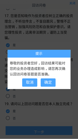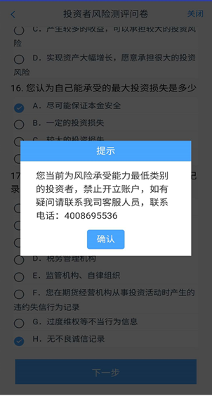 (2)重复开户提示。若客户填写信息使用的身份证号码是已经在我公司开通期货账户的,在个人基本资料页面点击“下一步”时,弹窗提示客户“您已开通期货账户,请选择办理其他业务。如有疑问请联系开户客户经理或在线客服。