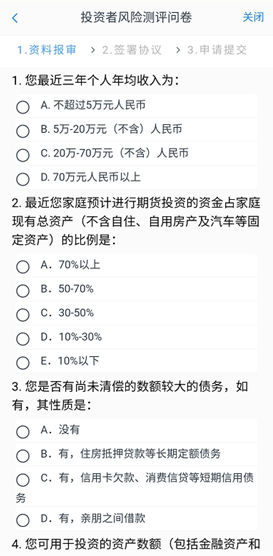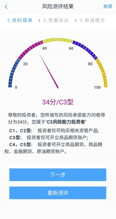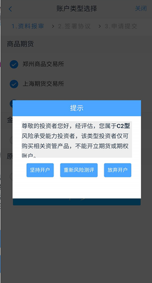 提交问卷后,系统将显示风险承受能力等级。如提交后发现问卷填写有误,可点击重新测评。如客户风险承受能力等级低于所申请的期货品种风险等级,系统将对客户进行风险提示,客户可根据实际情况决定是否坚持开户,并点击相应按钮进行下一步。如测评为风险承受能力最低类别的投资者,则无法开立期货账户。首次开户,只能选择三家商品期货交易所,如需申请中金所或能源中心交易编码,需待开户成功后在回到“业务选择”界面点击“增开交易编码。
