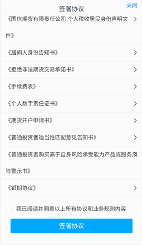 请逐一阅读所有开户协议,并勾选“我已阅读并同意以上所有协议和业务规则内容”,点击“签署协议”。