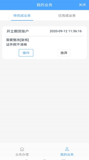 在首页“我的业务”的“待完成业务”中可查询开户复核进度,如被退回修改,则该界面有相应提示,点击“操作”,进入对应界面修改开户信息。