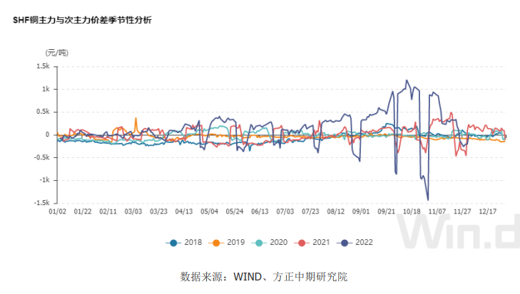 截止至2022年12月05日,沪铜主力合约CU2301收盘价为66,260元/吨,次主力合约CU2302收盘价为66,300元/吨,两者收盘价价差为-40元/吨,较上一日减少30元/吨。从季节性角度分析,当前价差较近五年相比维持在平均水平。