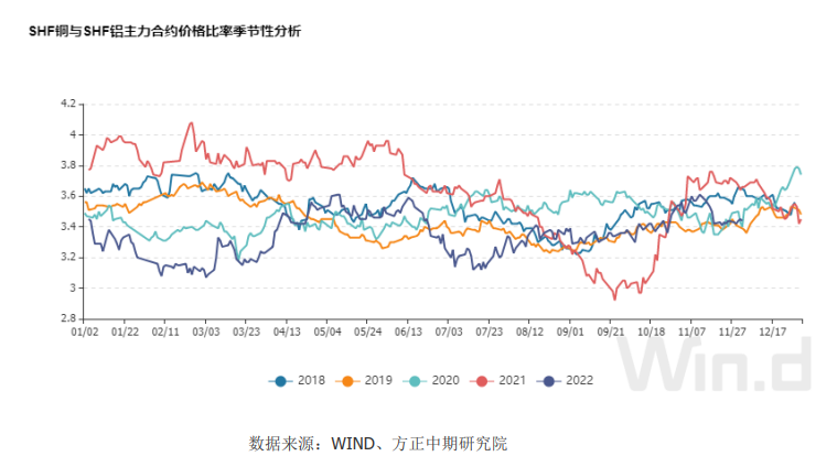 截止至2022年12月05日,沪铜主力合约CU2301收盘价为66,260元/吨,结算价为66,220元/吨;沪铝主力合约AL2301收盘价为19,320元/吨,结算价为19,270元/吨。以收盘价计算当前比价为3.43,从季节性角度分析,当前比价较近五年相比维持在较低水平。