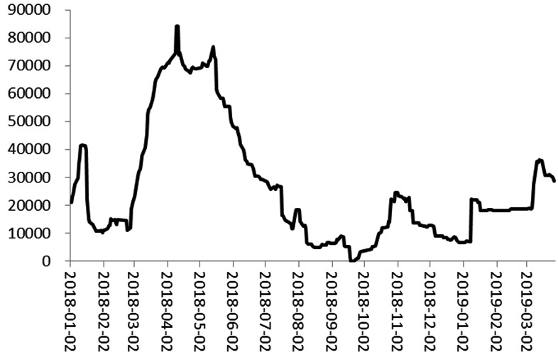 交易所的量仓数据显示,截至3月27日,PTA主力1905合约成交量为1859952手,较3月7日下降1187810手,降幅为38.87%;持仓量为913852手,较3月7日下降270038手,降幅为22.81%。同时,换手率为2.04,处于近期的偏高水平。PTA期货量仓双跌一方面受主力移仓的影响,另一方面受前期空头获利了结的影响。空头离场,表明后市下跌动能减弱。