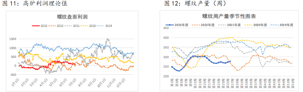 产业方面,六月日均铁水产量243.38万吨/天,环比上升3.23万吨,周度产量创全年新高,录得246.88万吨;在原料反弹下,钢价跟随上涨,钢厂生产利润进一步恢复,高炉盈利状况改善,钢厂主动减产意愿不足,周度产量始终维持270万吨全年高位附近波动;而终端钢材采购情绪在淡季下表现平淡,钢材消费仅维持在近年正常偏低水平,现货商根据盘面表现按需补库。