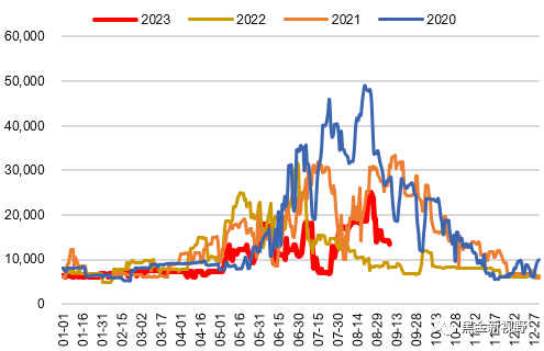 ⚫截至9月7日,沿海八省煤炭库存3712.60万吨,较上周下降14.60万吨,周环比下降0.39%;日耗为211.90万吨,较上周上升23.90万吨/日,周环比增加12.71%;可用天数为17.5天,较上周下降2.30天。 ⚫截至9月8日,三峡出库流量13500立方米/秒,周环比下降6.25%。 图 26:沿海八省区日均耗煤变化情况(万吨)