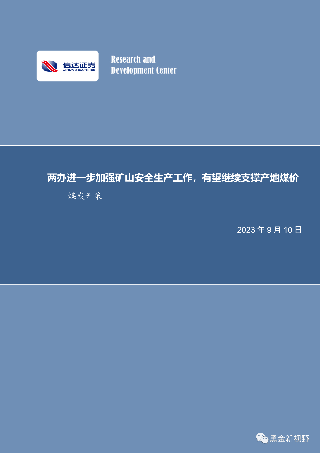本周产地煤价持续上涨。截至9月8日,陕西榆林动力块煤(Q6000)坑口价930.0元/吨,周环比上涨15.0元/吨;内蒙古东胜大块精煤车板价(Q5500)764.0元/吨,周环比上涨27.0元/吨;大同南郊粘煤坑口价(含税)(Q5500)735.0元/吨,周环比上涨35.0元/吨。 内陆电厂日耗环比上升。截至9月8日,本周秦皇岛港铁路到车5984车,周环比增加62.79%;秦皇岛港口吞吐42.4万吨,周环比增加22.54%。国内重要港口(秦皇岛、曹妃甸、国投京唐港)周内库存水平均值1061.4万吨,较上周的1051.00万吨上涨10.4万吨,周环比增加0.99%。截至9月7日,内陆十七省煤炭库存8269.40万吨,较上周下降11.70万吨,周环比下降0.14%;日耗为364.80万吨,较上周上升8.10万吨/日,周环比增加2.27%;可用天数为22.7天,较上周下降0.50天。 国际动力煤价格涨跌互现。港口动力煤:截至9月9日,秦皇岛港动力煤(Q5500)山西产市场价870.0元/吨,周上涨25.0元/吨。截至9月6日,纽卡斯尔NEWC5500大卡动力煤FOB现货价格87.0美元/吨,周环比下跌0.5美元/吨;ARA6000大卡动力煤现货价122.0美元/吨,周环比上涨2.0元/吨;理查兹港动力煤FOB现货价93.5美元/吨,周环比下跌1.6美元/吨。 焦炭方面:贸易商入市分流货源,焦炭基本供需结构收紧。根据煤炭资源网,截至2023年9月8日,汾渭CCI吕梁准一级冶金焦报1910元/吨,周环比持平。港口指数:CCI日照准一级冶金焦报2150元/吨,周环比上涨70元/吨。综合来看,焦炭市场暂稳运行,近日市场情绪在稳增长经济政策的带动下情绪高涨,黑色系价格持续走高,原料煤价格表现强势,焦化成本支撑走强,个别焦企考虑亏损有减产计划,整体供应相对稳定,随着进场拿货,焦企场内库存快速出清,下游钢厂到货表现继续好转,短期看焦炭基本面向好改善,后期关注原料煤以及成材的价格表现。 焦煤方面:市场信心较足,煤价稳中向好。根据煤炭资源网,截止9月8日,CCI山西低硫指数2073元/吨,日环比上涨30元/吨;CCI山西高硫指数1884元/吨,日环比持平;CCI灵石肥煤指数1850元/吨,日环比持平。产地前期非事故煤矿陆续复产,供应稳步增量,但目前仍未完全恢复。需求方面,近日大量入场采购,推动煤价快速上涨,市场情绪高涨,带动煤矿线下成交继续向好,涨价范围及幅度不断扩大。考虑到当下终端铁水产量高位,原料需求稳定,供需格局偏紧格局下市场参与者普遍持乐观心态,煤价短期延续偏强运行。 我们认为,当前正处在煤炭经济新一轮周期上行的初期,基本面、政策面共振,现阶段逢低配置煤炭板块正当时。本周,中共中央办公厅、国务院办公厅发布《关于进一步加强矿山安全生产工作的意见》,意见指出严格灾害严重煤矿安全准入。停止新建产能低于90万吨/年的煤与瓦斯突出、冲击地压、水文地质类型极复杂的煤矿。我们认为,本意见的出台短期将使煤矿安全生产监管再度升级,在产中小煤矿产量或将面临收缩,而在建煤矿的产能释放节奏则有望放缓;中长期看,有望加快推动从产业源头上推动地质灾害复杂严重的中小煤矿的关闭退出、整合重组和改造升级,在当前煤炭供需偏紧状态下或将导致煤炭供给更加趋紧。值得关注的是,由于炼焦煤和无烟煤煤矿多为高瓦斯、埋藏深、产能规模小的灾害严重井工煤矿,本次意见进一步要求停止新建低于90万吨/年的灾害严重煤矿,在当前我国焦煤供给已经处于衰减态势的基础上,未来焦煤供给或将更加趋紧。与此同时,在安全强监管导致产地煤炭供给收缩背景下,叠加煤炭非电需求环比改善,坑口煤价和港口煤价持续倒挂,本周煤炭市场整体仍偏强运行。能源大通胀背景下,未来3-5年煤炭供需偏紧的格局仍未改变,优质煤炭企业依然具有高壁垒、高现金、高分红、高股息的属性,煤炭板块投资攻守兼备且具有高性价比,建议积极把握阶段性调整带来的底部配置机会。 投资建议:结合我们对能源产能周期的研判,可以认为在全国煤炭增产保供的形势下,煤炭供给偏紧、趋紧形势或将持续整个“十四五”乃至“十五五”,或需新规划建设一批优质产能以保障我国中长期能源煤炭需求。在煤炭布局加速西移、资源费与吨煤投资大幅提升背景下,经济开发刚性成本的抬升有望支撑煤炭价格中枢保持高位,叠加煤炭央国企资产注入工作已然开启,愈加凸显优质煤炭公司盈利与成长的高确定性。当前,煤炭板块具有高业绩、高现金、高分红属性,叠加行业高景气、长周期、高壁垒特征,以及低估值水平和一二级估值倒挂,煤炭板块投资攻守兼备。我们继续全面看多煤炭板块,继续建议关注煤炭的历史性配置机遇。自下而上重点关注三条主线:一是内生外延增长空间大、资源禀赋优的兖矿能源、陕西煤业、广汇能源、山煤国际、晋控煤业等;二是在央企控股上市公司质量提升工作推动下资产价值重估提升空间大的煤炭央企中国神华、中煤能源等;三是全球资源特殊稀缺的优质冶金煤公司平煤股份、淮北矿业、山西焦煤、潞安环能、盘江股份等;四是建议关注可做冶金喷吹煤的无烟煤相关标的兰花科创、华阳股份等,以及新一轮产能周期下煤炭生产建设领域的相关机会,如天地科技、天玛智控等。 风险因素:重点公司发生煤矿安全生产事故;下游用能用电部门继续较大规模限产;宏观经济大幅失速下滑。 ✦ 正文目录 ✦ 一、本周核心观点及重点关注:两办进一步加强矿山安全生产工作,有望继续支撑产地煤价 二、本周煤炭板块及个股表现:煤炭板块优于大盘 