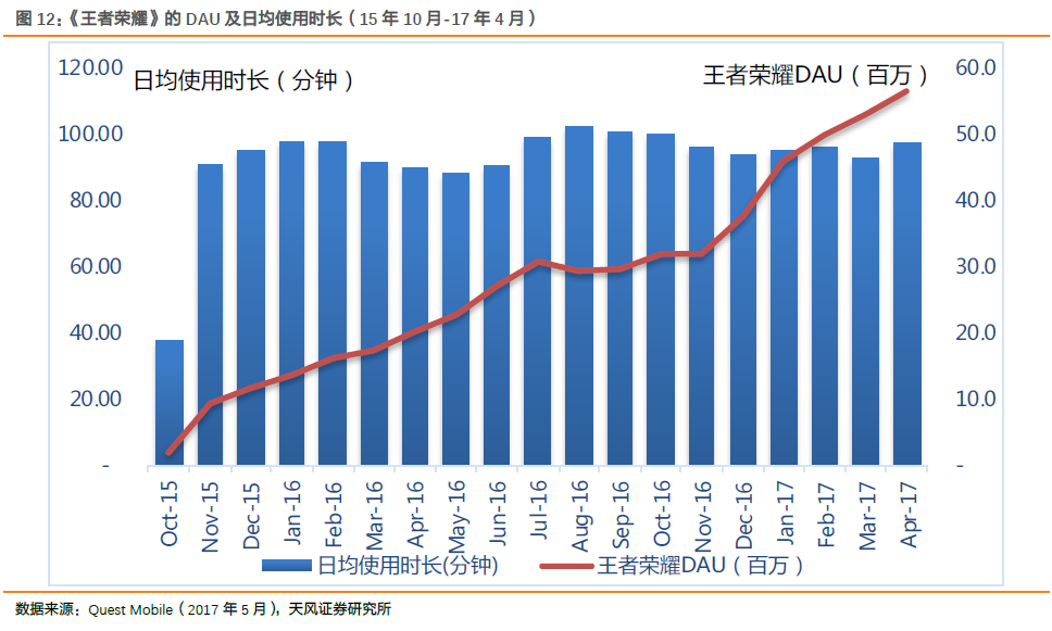 天风证券分析师文浩、王晨在报告中指出,《王者荣耀》完成了几乎全用户的覆盖,弥补了腾讯在手偶某些细分品类不足的缺失。参照Quest Mobile 数据,《王者荣耀》在2017年4月实现了日活跃用户(DAU)同比180.8%的高速增长,日均使用时长达到97.7 分钟,形成了对其余手游在使用时长上的挤压,进一步形成游戏的头部集中效应。