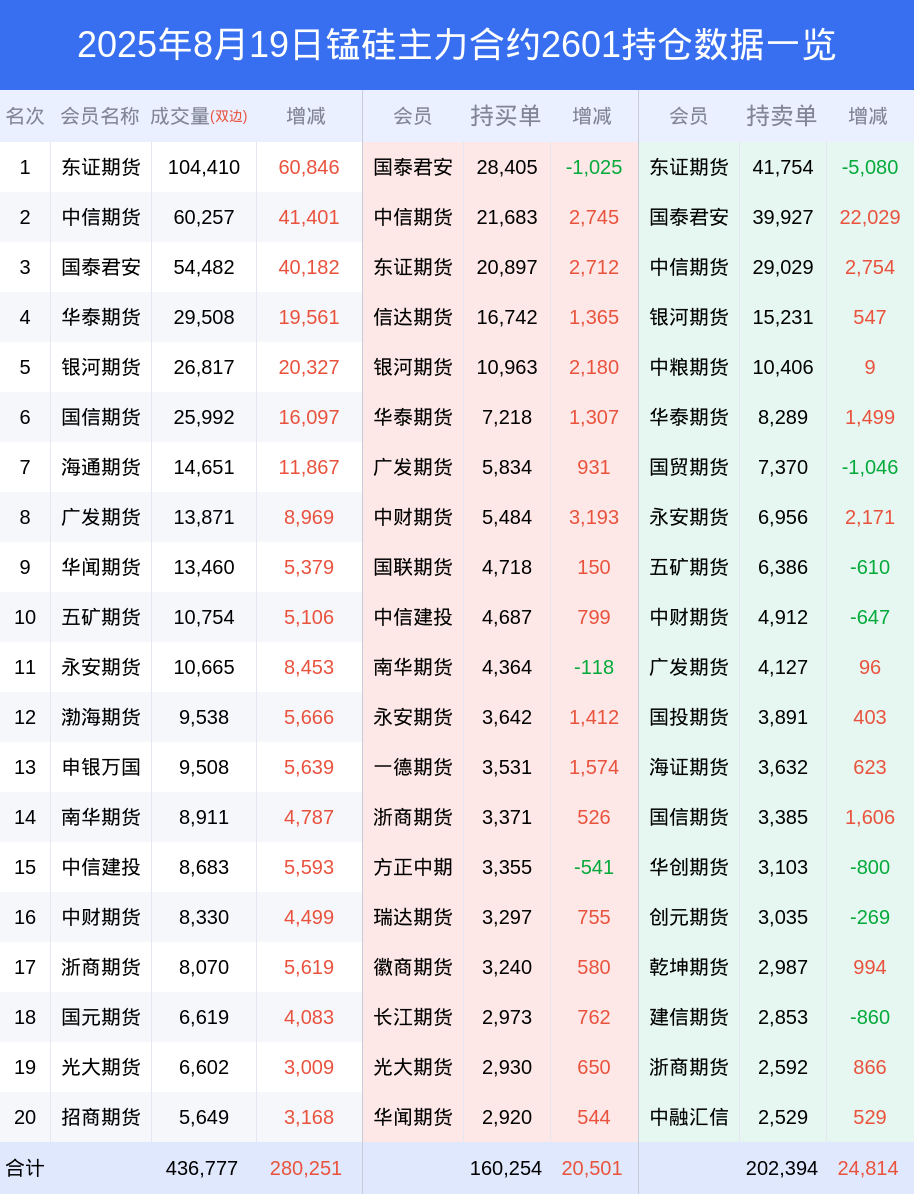 炒期货上新浪、实时行情信息全。2025年8月19日,锰硅主力合约锰硅2601跌3.21%,为全市场跌幅第2名。主力合约成交量31.09万手,前20席位净空,差额头寸42140手。全合约总计成交68.12万手,较上一日新增36.79万手。全