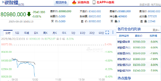 炒期货上新浪、实时行情信息全。 快讯:2025年8月20日,碳酸锂主力合约触及跌停,跌幅8%,报80980元/吨。...--新浪财经领先金融信息服务平台