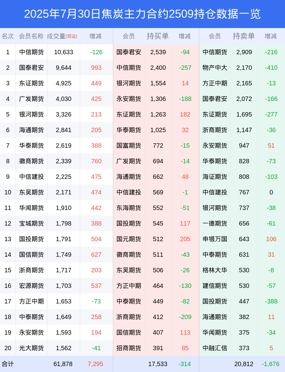 炒期货上新浪、实时行情信息全。新浪期货 根据交易所数据,截至7月30日收盘主力合约焦煤2601,涨跌+5.88%,成交量169.79万手,持仓数据显示前20席位呈现净空,差额头寸为55585手。焦煤期货全合约总计成交373.89万手,