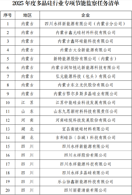 工业和信息化部办公厅关于印发2025年度多晶硅行业专项节能监察任务清单的通知