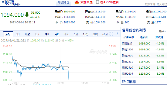 炒期货上新浪、实时行情信息全。 快讯:2025年8月1日,玻璃主力合约跌破1100元/吨,日内跌超4.5%。 7月底玻璃下游深加工订单天数略有增加,需求略有好转,玻璃日熔量低位震荡,供需弱平衡。近期市场焦点仍在反