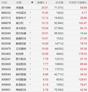 A股市场消费电子概念股全线大涨,其中,鸿富瀚20CM涨停,中科蓝讯涨超15%,智新电子涨超13%,福立旺涨超10%,徕木股份、国光电器、盈趣科技、鹏鼎控股、立讯精密、和而泰10CM涨停,歌尔股份、领益智造、蓝思科技涨超