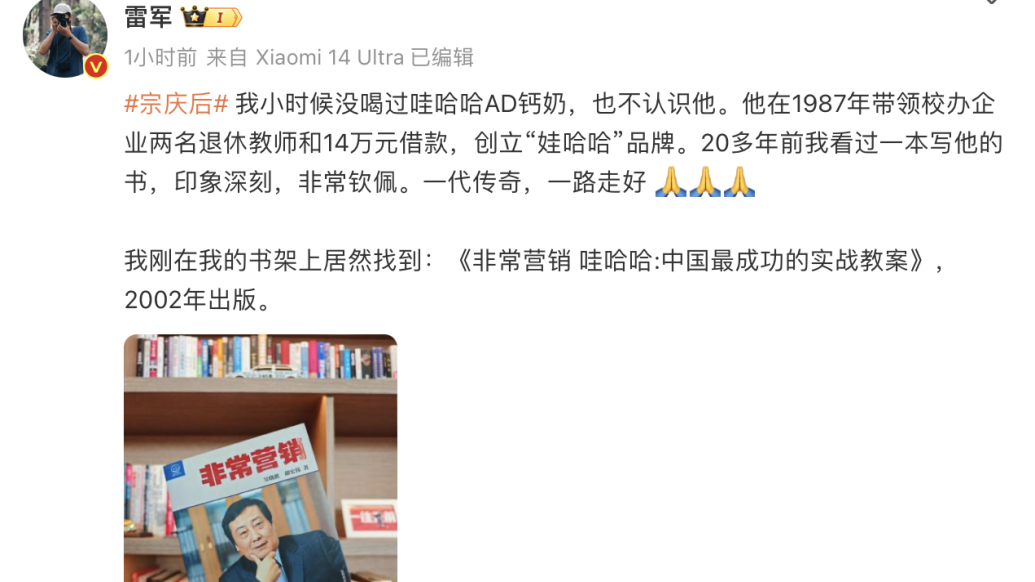 2月25日,小米董事长兼CEO雷军在微博两度发文悼念宗庆后,“我小时候没喝过哇哈哈AD钙奶,也不认识他。他在1987年带领校办企业两名退休教师和14万元借款,创