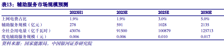随着新能源装机占比提高,辅助服务占电费比例随之提高。预计2025年、2030年辅助服务占上网电费的比例达到3%、5%,和现阶段国际水平相当。考虑全社会用电量增长趋势,测算得出2025年、2030年辅助服务总市场规模将超过1000亿元、2000亿元,度电辅助服务规模达到0.01元、0.017元。
