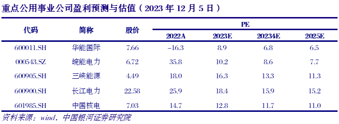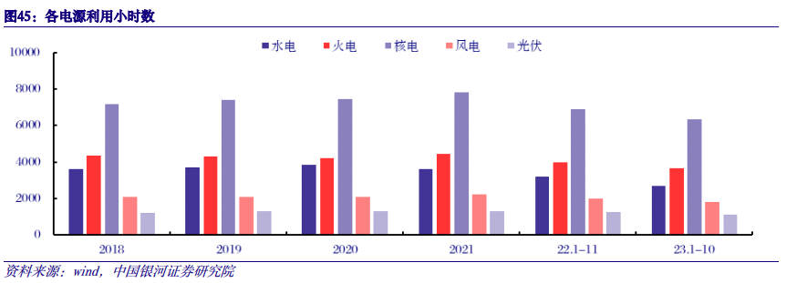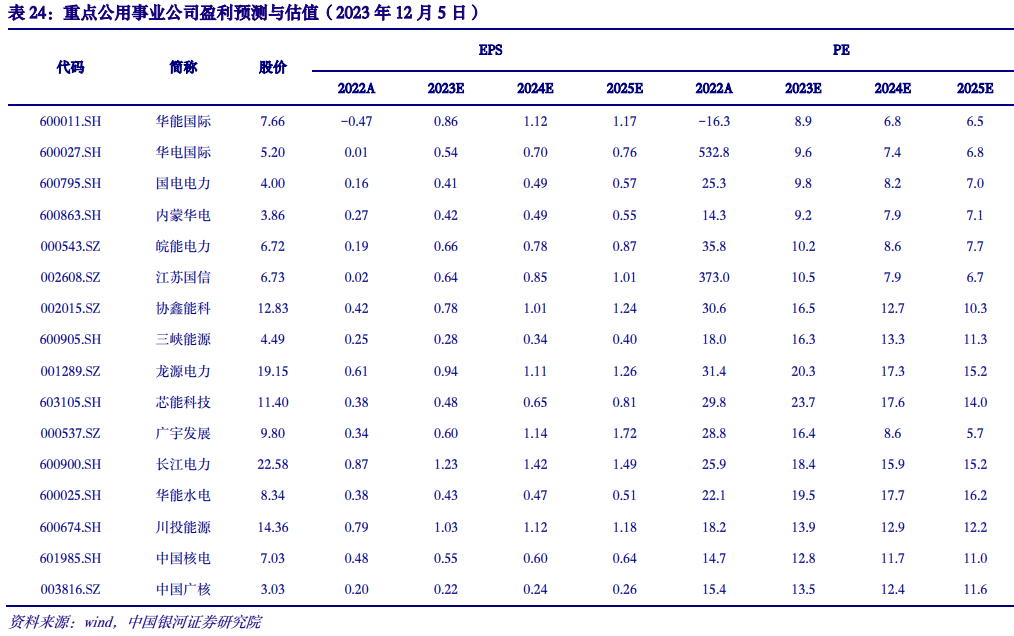 六、投资策略 电改持续深化,电力行业迎估值、成长机遇。目前市场电占比超过60%,全国统一电力市场建设加速,在提升资源配置效率的同时,兼具指导性和计划性。电量角度,中长期发挥保供稳价作用并与现货衔接,省间交易优先级高于省内;电价角度,电力商品价值多维化,传统能源保供价值和新能源绿色环境价值占比上升,辅助服务、绿电绿证等政策有望进一步完善。过去10年,水电板块估值波动上行,PB由2014年初1.61x提升至目前2.31x,其主要受益于水电盈利稳定性和高分红率。目前火电、核电PB分别为1.00x、1.43x;随着电改推进,火电盈利稳定性持续提升,核电作为清洁的基荷能源,兼具稳定性和成长性;火电、核电估值均有较大修复空间。而新型电力系统建设的日趋完善,强大的系统调节能力,也将打开新能源装机的长期增长空间。 火电:盈利继续改善,保供价值属性推动估值重塑。今年以来市场煤价下跌超20%,长协履约率提升20%左右,火电盈利逐季度改善。华能国际Q1/Q2/Q3煤电度电利润总额分别为-0.001元/0.008元/0.026元。我们判断迎峰度冬期间煤价反弹空间有限,入炉煤价重心有望持续下移,火电板块2024年业绩有望持续改善。 在新型电力系统下,火电调峰、调频等保供价值持续提升,近期全国范围煤电容量电价落地,2024-2025年多数省份补偿比例30%;2026年起各省补偿比例不低于50%。火电迎“两部制”电价里程碑。未来全国性辅助服务相关政策亦有望落地,火电政策催化不断。我们测算,至2030年火电将有1/3左右收入来自容量电价和辅助服务,其对于煤价、电价敏感性低,推动盈利稳定性大幅提升。目前火电板块PB均值为1.00x,随着盈利稳定性持续提升,板块PB有望向核电PB1.43x、水电PB2.31x靠拢。建议关注华能国际、华电国际、国电电力、内蒙华电、皖能电力、江苏国信等。 核电:稳定性优异,政策转向积极,远期装机具备6倍以上空间。核电作为清洁能源优先上网,年利用小时数长期稳定在7000小时以上,盈利能力具备高度稳定性。十四五以来,核电政策转向积极,2019~2023(M10)我国核电审批分别为6/4/5/10/6台,加速趋势明显。预计2025、2030年我国核电在运装机将分别达到7000万千瓦、1.1亿千瓦。根据中国核工业数据,我国初步勘查选择的核电站厂址容量可以支撑4亿千瓦的装机规模,按照目前在运装机5699万千瓦测算,远期装机成长空间超过600%。建议关注中国核电、中国广核。 新能源:能源转型下主力电源,长期量、价成长空间大。目前新能源累计装机9.4亿千瓦,占比33%。能源转型大背景下新能源将成为主力电源,预计2025年、2030年新能源累计装机将超过14亿千瓦、20亿千瓦。随着绿色环境价值市场体系完善,绿电、绿证交易大幅提升,且绿色环境价值将直接对标碳市场价格。新能源通过环境市场回收绿电溢价,增厚盈利水平。建议关注三峡能源、龙源电力、芯能科技、广宇发展。 水电:量、价仍有弹性,低利率时代凸显稳定性价值。装机方面,大水电开发接近尾声,水风光一体化打开新成长空间。电价方面,目前水电电价普遍大幅折价,四川、云南年均上网电价仅为0.2-0.25元/千瓦时,较当地煤电标杆电价低35%-45%,市场化有望推动电价持续上行。货币宽松带动利率中枢下行,水电稳定性价值凸显。过去10年间长江电力PE(TTM)由14.2x提升至23.0x,涨幅62%,远超同期沪深300指数5%的涨幅。建议关注长江电力、华能水电、川投能源。