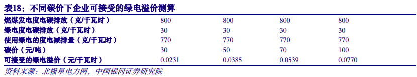 碳排放管控支撑绿电溢价。2021年欧洲议会通过了碳边境调剂机制(CBAM)的决议,正式启动立法进程。2023年至2025年为过渡期,CBAM将配合欧盟排放交易体系政策于2026年起生效,覆盖行业为水泥、钢铁、铝、化肥、电力等。CBAM的实施方式为欧盟各成员国主管部门向各国高排放商品的进口商按需出售CBAM凭证,因此国内的出口企业更有意愿使用绿电去节约碳边境税带来的成本增长,绿电溢价将得到支撑。根据一般经验,如果采用绿电代替煤电,度电减排700-800g二氧化碳,我们测算,当碳价在50元/吨时,企业能够接受的绿电溢价大概在0.035-0.04元/度之间,随着未来碳价的进一步升高,不使用绿电的消费者承担的碳成本比例就越高,对绿电的需求和溢价的接受度也就越高。