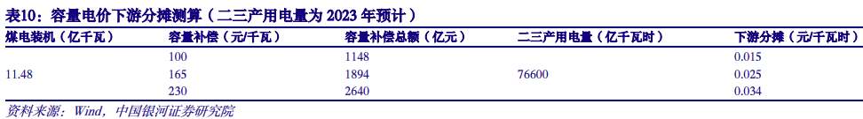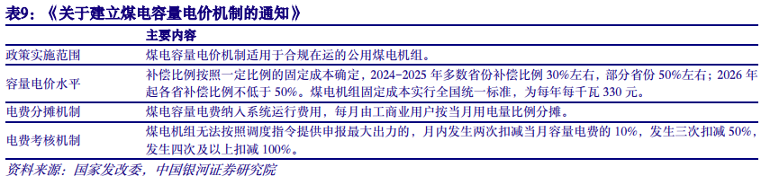 2. 容量电价:全国范围煤电容量电价落地,成煤电重要业绩稳定器 全国范围煤电容量电价落地,电价机制改革进一步深化。国家发改委、国家能源局印发《关于建立煤电容量电价机制的通知》。《通知》明确了政策实施范围、容量电价水平、容量电费分摊机制与容量电费考核机制,自2024年1月1日起实施。2022年以来,山东、甘肃、云南等省份已制定煤电容量电价政策。本次《通知》标志着全国范围煤电容量电价政策落地,电价机制改革进一步深化,为承载更大规模的新能源提供有力支撑,是更好促进能源绿色低碳转型的必然要求。 2024-2025年多数省份补偿比例30%,2026年起提升至不低于50%。《通知》明确煤电容量电价按照回收煤电机组一定比例固定成本的方式确定。其中,煤电机组固定全国统一为每年每千瓦330元。2024-2025年多数地方补偿比例为30%左右,部分煤电功能转型较快的地方(四川、云南等7省)为50%左右。2026年起,将各地通过容量电价回收固定成本的比例提升至不低于50%。按照目前煤电装机11.5亿千瓦、2022年煤电利用小时4594小时、补偿标准30%测算,每年煤电容量补偿总规模1150亿元,对应度电盈利增厚0.022元。