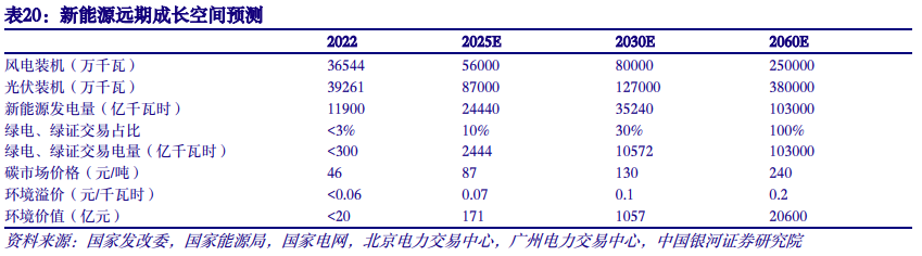 3. 盈利展望:2025、2030年环境价值200亿元、1000亿元 2025、2030年,环境价值约为200亿元、1000亿元。结合我们的预测以及国家电网全球能源互联网发展合作组织预测,2025、2030年、2060年我国新能源总装机将分别达到14亿千瓦、20亿千瓦、63亿千瓦。随着绿色环境价值市场体系完善,预计远期绿电、绿证交易将实现全覆盖,且绿色环境价值将直接对标碳市场价格。根据《2022年中国碳价调查报告》,预计到2025年碳价将升至87元/吨,在2030年前将达到130元/吨,本世纪中叶将达到239元/吨。据此推算,2025环境价值将达到171亿元,2030年将达到1057亿元。