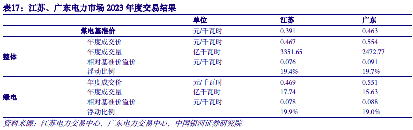 绿电交易赋予绿色电力环境价值。2021年9月,国家发改委、国家能源局共同推动在北京、广州两大电力交易中心开展绿色电力交易试点工作,并在中长期电力交易框架下,设立独立的绿电品种。从广东、江苏公布的2023年电力市场年度交易结果来看,绿电交易价格全面高于当地煤电基准价,其中江苏省绿电交易价格高于市场平均。通过市场价格信号,体现了绿色电力除电能价值以外的环境价值。