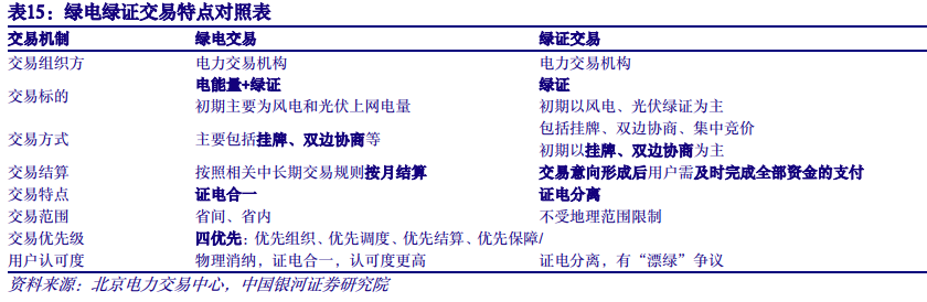 2. 电价:碳价上涨空间大,打开绿电溢价上涨空间 绿电、绿证交易是促进可再生能源发展、推动能源消费清洁低碳转型的重要抓手。因此,无论“证电合一”的绿电交易,还是“证电分离”的绿证交易,都只是用户获得可再生能源消费凭证、新能源企业获得绿色环境价值的手段。需要通过对绿电、绿证交易的协同组织,促进两个市场绿色环境权益价格趋同,实现良性发展。
