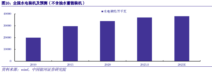 十四五有序开发上游大水电,建设水风光综合基地。根据《“十四五”可再生能源发展规划》,现阶段有序开发雅鲁藏布江下游、金沙江上游、黄河上游等大水电;积极推动大水电优化升级,发挥水电调节能力,推进已建、在建水电机组增容改造;此外,依托主要流域周边风能、太阳能资源,重点建设川滇黔桂水风光综合基地以及藏东南水风光综合基地。根据《“十四五”现代能源体系规划》,预计2025年常规水电装机达到3.8亿千瓦,2024-2025年装机增量约为1000万千瓦,占目前累计装机3%左右。