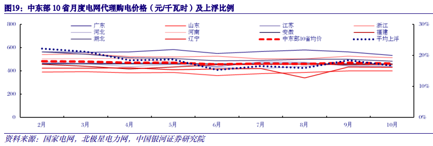 年初以来煤电上网价格有所松动,目前平均上浮仍超过15%。2021年下半年,受环保限产、澳洲煤炭进口缺失、疫情后经济复苏等影响,煤价大幅上涨并持续刷新历史新高。煤价高企倒逼电价市场化改革加速,煤电上网电价浮动范围扩大至20%,至2023年初各省煤电上网电价基本实现20%顶格上浮。今年以来,随着煤价进入下行通道,各省煤电上网电价开始松动。我们选取用电量排名前列的中东部省份,由于其电量以煤电为主,所以能够最大程度减少水电和新能源季节性出力变化对平均上网电价的影响,因而电网代理购电价格(平均上网电价)能够客观反映煤电上网价格变化。2023年2月-10月,中东部10省月度电网代理购电均价由上浮22.2%下降至上浮16.7%。
