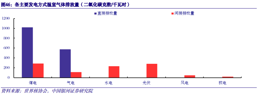核电属于清洁能源,可以有效减少碳排放。核能发电过程不产生温室气体排放,一台百万千瓦级的核电机组全年发电量接近80亿度,与相同等级的燃煤机组相比,等效减少二氧化碳排放640万吨。从不同电源品种全生命周期碳排放强度来比较,核能发电的碳排放强度低于水电和新能源,同时核能发电也不产生二氧化硫、氮氧化物等其他大气污染物,清洁低碳优势十分明显。