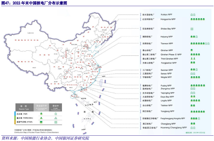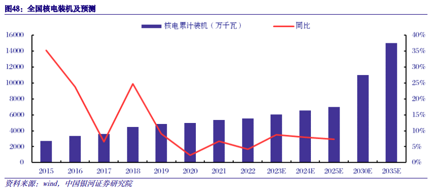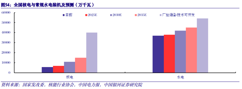 核电储备厂址丰富,装机成长性优于水电,远期具有6倍以上增长空间。目前我国常规大水电开发接近尾声,下一阶段主要开发雅鲁藏布江下游、金沙江上游、黄河上游等大水电,全国水电技术可开发装机容量为5.42亿千瓦,远期装机成长空间<50%;相比之下,核电受厂址制约因素较少,根据中国核工业数据,我国初步勘查选择的核电站厂址容量可以支撑未来4亿千瓦的装机规模,完全能够满足2035年核电装机1.5亿千瓦的目标。按照目前核电在运装机5699万千瓦测算,预计远期装机成长空间>600%。