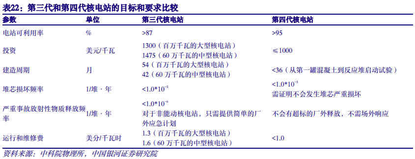 第四代核电蓄势待发,首个示范项目已实现满功率运行。第四代核电站的主要开发目标主要有核能的可持续发展,即通过对核燃料的有效利用,实现提供持续能源,并实现核废物的最少化;提高安全性和可靠性,大幅度降低堆芯损伤的概率集成度,并具有快速恢复反应堆运行的能力,取消在厂址外采取应急措施的必要性;提高经济性以及防止核扩散等。四代核电有6条先进堆型,分别是钠冷快堆、超高温气冷堆、铅冷快堆、熔盐堆、超临界水冷堆和气冷快堆。我国石岛湾高温气冷堆核电站示范工程项目,已于2021年底实现并网发电,并于2022年首次实现双堆初始满功率运行;此外,中核霞浦600MW示范快堆工程处于在建状态。