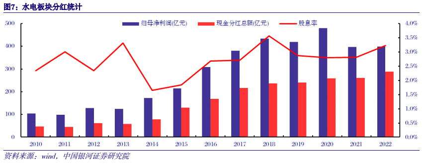二、水电:稳定性提振估值,量、价仍有弹性 (一)盈利能力稳定,估值波动上行 水电盈利能力稳定,分红率持续提升、股息率高。水电项目前期投入大,建设周期长,但进入运营期后商业模式清晰,其高比例折旧成本带来充沛现金流。随着全国常规大水电开发进入尾声,资本开支进入下行周期,板块分红率逐步提升。2010-2022年,水电板块分红率由44.6%提升至72.5%,年均增加2.3pct。股息率由2.34%提升至3.22%,年均增加0.07pct。此外,考虑到水坝使用年限远高于财务折旧年限,因此远期净利润将受益于折旧到期而进一步提升。