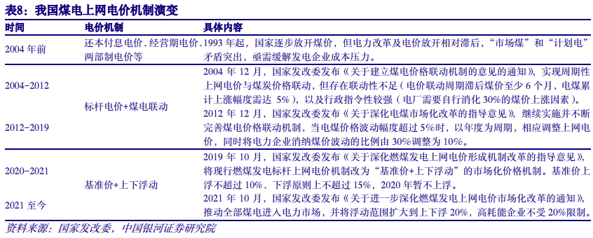 (二)收入端:上网电价多元化,煤电盈利稳定性提升 上网电价多元化,煤电盈利稳定性提升。目前煤电收入主要来自电能量市场,受煤价、电价影响较大,盈利能力易大幅波动。随着新型电力系统建设推进,煤电向支撑性和调节性电源转变,其支撑性和调节性价值将通过容量电价、辅助服务市场回收。电改深化背景下,煤电利用小时数走低,容量电价、辅助服务在上网电价中占比将不断增加,两者不受煤价影响,提升煤电盈利稳定性。 1. 电量电价:煤电全部进入市场,煤价下行推动电量电价回落 电力市场化改革持续深化,煤电已全部进入市场。回顾煤电上网电价机制演变,早期由于煤炭先于电力实行市场化改革,“市场煤”和“计划电”矛盾突出,亟需缓解发电企业成本压力。在此背景下,国家发改委2004年出台“标杆电价+煤电联动”价格机制。煤电联动机制对规范政府定价行为、促进发电侧价格体系合理形成、激励电力企业效率提升、推动煤电及上下游产业健康发展发挥了重要作用,但仍存在联动性不足(电价联动周期滞后煤价至少6个月,电煤累计上涨幅度需达 5%),以及行政指令性较强等弊端(电厂需要自行消化30%的煤价上涨因素)。2019年为贯彻落实中发9号文,国家发改委出台“基准价+上下浮动”价格机制,推动全部煤电进入市场;2021年煤价高企倒逼浮动范围扩大到上下浮20%,高耗能企业不受20%限制。