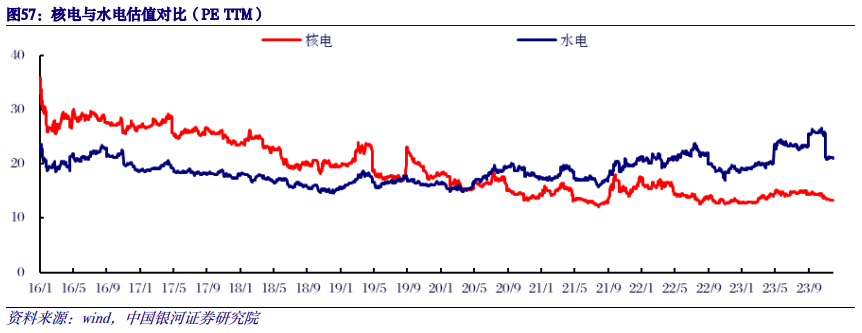 核电兼具成长性和确定性,估值修复空间大。核电与水电都具有“固收+”性质,盈利能力稳定,具有较强防御属性;从成长性角度,核电储备厂址丰富,远期装机增长潜力远高于水电。2016年以来,由于核电发展政策不确定性,以及水电业绩高度稳定、分红比例持续上升的共同作用,水电板块估值反超核电。截至目前,核电板块估值(PE TTM)仅为13.2倍,低于水电板块21.1倍,估值水平有较大修复空间。