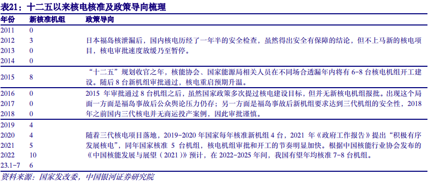 核电审批速度加快,有望迎来新一轮景气周期。鉴于国家对于核安全、环保的高度重视,我国政府对核电项目及业主采取核准、发放许可(金麒麟分析师)证、执照等方式,对投资主体进入市场进行管理。其中,国家核安全局对核电厂选址、建造、首次装料、运行以及退役等各阶段的安全工作进行审评和监督,颁发相应的许可证件或批准文件,并实施驻厂监督;生态环境部对环境影响报告书等进行审查,并对运行核电厂的辐射环境实施监督性监测。核电项目由国家发改委负责审查其项目申请报告,并报国务院核准。2011年日本福岛核泄漏后,国内核电审批速度放缓乃至暂停;2019年以来,随着三代核电项目落地,核电审批重启并加快,至2022年达到创纪录的10台。2021年3月的《政府工作报告》中提出“在确保安全的前提下积极有序发展核电”,这是近10年来首次使用“积极”来对核电进行政策表述。在“碳中和”的大背景下,我国提出2030年非化石能源消费占比达到25%的承诺,核电有望迎来新一轮发展的政策机遇期。