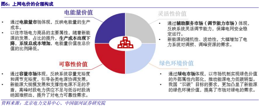 2. 电价:价值多维化,调节性价值和绿色环境价值占比上升 电力商品价值多维化,传统能源调节性价值和新能源绿色环境价值占比上升。在新型电力系统下,随着新能源逐步成为装机、电量主体,电力商品的价值较以往出现细分,由以电能量价值为主,逐步向电能量价值、调节性价值(可靠性价值和灵活性价值)以及绿色环境价值等多维价值体系转变。其中电能量价值通过电能量市场体现,反映电能量的生产成本。随着新能源占比提升,生产成本出现下降,电能量价值在总价值的比例降低;可靠性价值通过容量市场体现,反映系统容量充裕度和调节充裕度,引导各类电源协调发展;灵活性价值通过辅助服务市场体现,反映系统灵活调节能力,保障电网安全稳定运行;绿色环境价值通过绿电市场体现,以市场机制实现绿色价值的外部属性内部化,推动能源电力低碳转型。