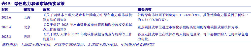 北京、天津、上海已经出台绿电和碳市场衔接的政策,使用绿电不计入碳排放。今年以来,天津、北京、上海等地生态环境部门先后出台关于绿电交易与碳排放的相关政策,对绿电的碳排放进行了明确规定。京津沪三地均为国家批复的区域碳市场试点地区,三地的相关政策提高了本地企业采购绿电的积极性,推动了电碳的进一步协同发展,同时给其他省份出台相关政策提供了范本。