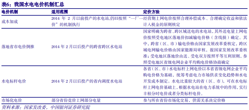 2. 电价:市场化电量提升,推动水电电价上行 我国水电上网电价政策呈多样化格局,分为按成本加成(经营期上网电价)、落地省市电价倒推、标杆上网电价和市场化交易电价等。根据国家发改委2014年1月《关于完善水电上网电价形成机制的通知》,2014年2月以前投产的水电站,按照“一厂一价”经营期上网电价机制执行;2014年2月以后投产的省内消纳水电站,其优先电量按照省内标杆电价执行,并实行丰枯分时电价或分类标杆电价,优先电量以外的电量进入市场化交易;2014年2月以后投产的跨省跨区水电站,其电价由两省政府协商决定,一般情况下,按照落地省市电价倒推得出。