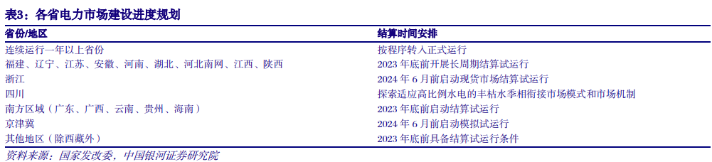 各省现货市场建设进度明确。现货交易有利于反映市场供需变化、发挥市场在电力资源配置中的决定性作用、提升电力系统调节能力、促进可再生能源消纳,促进电力系统转型。10月12日,国家发改委、国家能源局发布《关于进一步加快电力现货市场建设工作的通知》(发改办体改〔2023〕813号)。本次《通知》明确了各省电力现货推进节点,其中连续运行一年以上省份,可按程序转入正式运行;《通知》扩大了市场参与主体,按照2030年新能源全面参与市场交易的时间节点,推动分布式、储能、虚拟电厂等参与现货市场。本次文件与此前9月印发的国标文件《电力现货市场基本规则(试行)》主旨一致,即按“基本共识+因地制宜”的原则,推动各地现货开展,各市场衔接,加快构建全国统一电力市场体系。