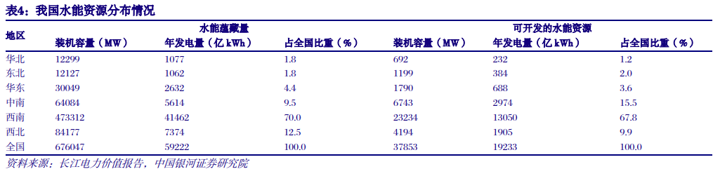 (二)水风光一体化打开成长空间,市场化推动水电电价上行 1. 装机:常规水电开发接近尾声,水风光一体化打开成长空间 常规水电开发接近尾声,优质大水电稀缺性强。根据中国水力资源复查结果,仅考虑理论蕴藏量在1万千瓦及以上的河流,我国水电资源理论蕴藏量装机6.94亿千瓦,理论蕴藏量对应年发电量为6.08万亿千瓦时;装机容量500万千瓦及以上水电站的技术可开发装机容量为5.42亿千瓦,对应年发电量为2.47万亿千瓦时;经济可开发装机4.02亿千瓦。截至2023年8月,我国常规水电装机容量已达3.7亿千瓦,占经济可开发装机90%以上。进入十四五以来,随着金沙江白鹤滩电站和乌东德电站、雅砻江两河口电站河杨房沟电站投产,“十三大”水电基地装机500万千瓦以上水电站基本投运完毕,优质大水电稀缺性明显。