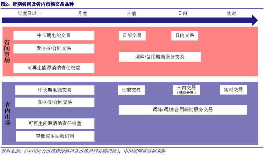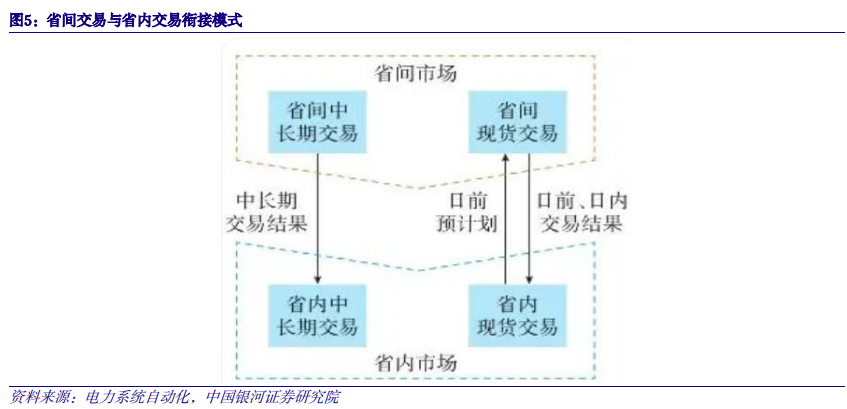 1. 电量:省间优先级高于省内,中长期与现货衔接 构建“统一市场、两级运作”电力市场框架,省间交易先于省内执行。电力市场分为省间市场和省内市场,其中省间市场定位于落实国家能源战略,促进清洁能源消纳和能源资源大范围优化配置,建立资源配置型市场;省内市场定位于优化省内资源配置,确保电力供需平衡和电网安全稳定运行,建立电力平衡型市场。因此,需要在满足大范围资源优化配置的前提下,保证省内电力基本平衡,“两级运作”意味着省间交易优先级高于省内。中长期交易方面,省间中长期交易物理执行,省间交易结果作为省内交易的边界;现货交易方面,首先在省内形成预平衡,再开展省间日前现货。当送端有富裕能力、通道有剩余空间、受端有购电需求时,组织送受端市场主体自主报量报价,实现电力市场化余缺互济和清洁能源大范围消纳。