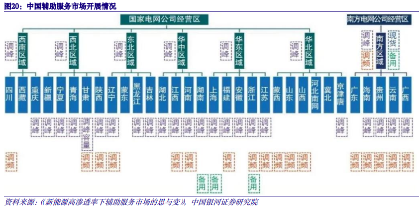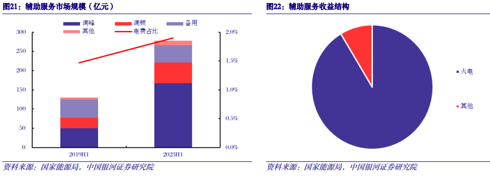 3. 辅助服务:彰显火电保供价值,规模迅速增长仍有较大提升空间 我国现行的辅助服务品种划分依据主要为2021年修订的《电力辅助服务管理办法》。各类电力辅助服务品种补偿机制主要包含有功平衡服务(调峰、调频、备用等)、无功平衡服务(自动电压控制、调相)以及事故应急恢复服务(稳定切机、稳定切负荷、黑启动)。基本辅助服务以及辅助服务的固定补偿主要参照各区域以及部分省内颁布的“两个细则”进行考核以及补偿。我国已初步形成以调峰、调频、备用等交易品种为核心的区域、省级辅助服务市场体系。区域辅助服务市场以区域调峰辅助服务为主,实现了调峰辅助服务资源在区域内的共享互济,有效提高了区域电网对新能源的消纳能力;省级辅助服务市场主要开展了调峰辅助服务和调频辅助服务。