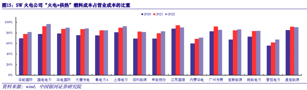 三、火电:盈利继续改善,业绩稳定性提升促估值重塑 (一)成本端:入炉煤价下行,盈利能力有望持续改善 煤价占营业成本比重高,煤炭价格是利润决定因素。火电厂成本端以燃料成本为主,其次是折旧和运维等相对固定的成本,以及财务费用等期间费用。多年平均来看,燃料成本占营业成本的70-80%左右,因此煤价是火电厂盈利的决定性因素。十四五以来由于煤价整体上涨,因此2021-2022年燃料成本占营业成本的比重超过80%。根据15家火电企业经营数据,2020、2021、2022年燃料成本占营业成本比重平均值分别为74%、84%、85%。