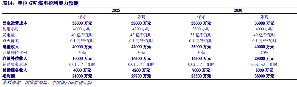 容量补偿、辅助服务比例有望提升,增强煤电盈利稳定性。以煤电为例,其固定运营成本主要包括折旧、运维、财务费用等;其收入主要来自电能量(点火价差)、容量补偿以及辅助服务。预计2025年,煤电利用小时数将由目前4600小时下滑至4000-4200小时,容量补偿比例在30-50%,辅助服务度电收入0.01元,据此测算,单位GW煤电每年利润总额可达2.1-3亿元左右。随着火电利用小时数不断走低,容量补偿和辅助服务比例有望进一步提升,增强煤电盈利稳定性。我们测算2030年单位GW煤电每年利润总额可达2.55-3.8亿元左右。