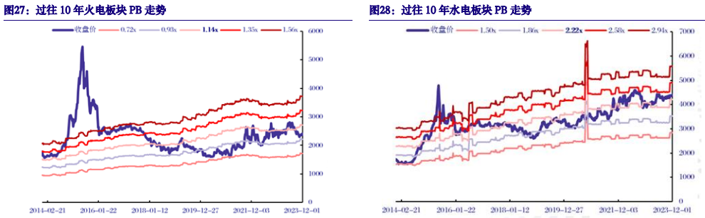 火电估值有望向水电靠拢,估值修复空间大。过去10年间,火电板块PB均值为1.14,水电板块PB均值为2.22x,火电估值相对水电低49%。长期电改将推动业绩从强周期性转向高度稳定性,且在发展新能源方面具有消纳优势,估值有望迎来重估,带动火电板块估值向水电靠拢。