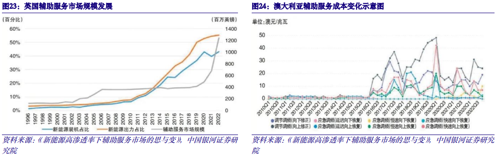 借鉴国外电力市场发展经验,新能源到达临界点后辅助服务规模迅速增加。(1)英国:2019-2022年间,新能源电量占比由23.8%提升至31.2%。2019年以前,随着新能源渗透率不断提升,英国辅助服务市场规模稳步提升,但由于2020年以来新能源渗透率不断提升以及新型冠状病毒肺炎疫情流行引起的负荷水平降低的双重影响,英国辅助服务市场规模急剧扩张。(2)澳大利亚:2016-2022年间,新能源电量占比由7.7%提升至23.5%。2016年以前,澳大利亚国家电力市场中频率控制辅助服务通常占全年电力市场交易额的0.5%以下。2016年以后伴随着大规模新能源并网以及电源结构的显著变化,澳大利亚电力系统频率急剧恶化,推动辅助服务需求及市场价格迅速攀升。