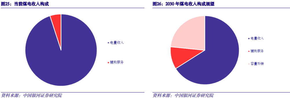 (三)收入结构变革,稳定性持续提升;火电板块估值重塑可期 煤电从主力电源向支撑性和调节性电源转变。煤电固定运营成本主要包括折旧、运维、财务费用等;其收入主要来自电能量(点火价差)、容量补偿以及辅助服务。目前煤电收入主要来自电能量市场,受煤价、电价影响较大,盈利能力易大幅波动;至2030年,随着煤电向支撑性和调节性电源转变,利用小时数逐渐走低,预计将有1/3左右收入来自容量补偿和辅助服务,其对于煤价、电价敏感性低,推动煤电盈利稳定性大幅提升。长期来看,容量补偿和辅助服务占比将持续提高,推动煤电盈利稳定性继续提升。