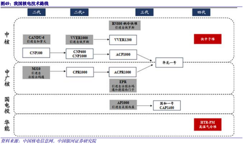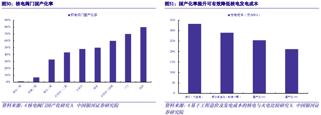 三代技术趋于成熟,国产研发替代有利于降低核电建造成本。我国核电目前的整体技术水平处于第二代改进型向第三代核电技术过渡阶段。三代核电技术提高了发电效率和单机组容量,且更关注设备安全,建设成本较二代+有所提高,在AP1000基础上自主研发的三代核电技术CAP1000的建设成本为14000元/kW,华龙一号建设成本达17390元/kW。受益于国产化研发替代,批量化建设后有望降低建设成本。以核级阀门研发为例,核电阀门作为机组建设中使用数量较多的介质输送控制设备,目前已达到近80%的国产化程度,而国产核级阀门价格仅为进口阀门的11.5%。