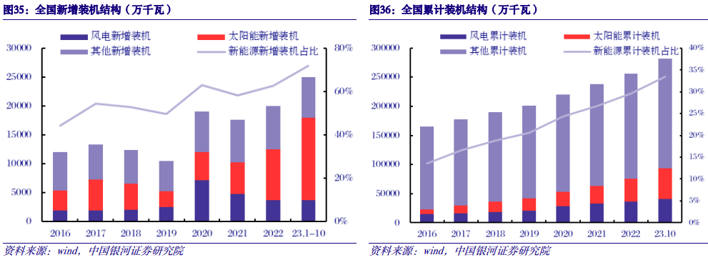 (二)成本下降刺激装机需求,十四五末风光装机超过14亿千瓦 新能源逐渐成为新增装机主力,2023年1-10月新能源新增装机占比超过70%。“双碳”目标驱动能源清洁化转型,新能源在新增装机及累计装机的比重稳中有升。2023年1-10月新能源新增装机总共180GW,同比+127%,占据同期新增装机的72%;截至2023年10月,新能源累计装机达到940GW,占同期累计装机的33%。展望十四五后续年份,《“十四五”可再生能源发展规划》明确提出2025年风电和太阳能发电量较2020年实现翻倍。风光大基地、海上风电、分布式光伏发展空间广阔,支撑新能源装机持续高速增长。我们预计2025年风电和光伏合计装机量将超过14亿千瓦(1400GW),较目前仍有400-500GW左右的增量。