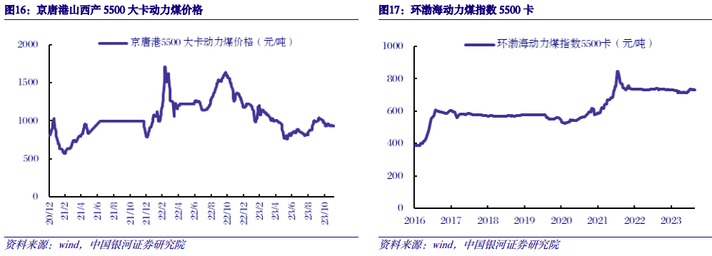 今年煤炭供需同比明显宽松,煤价波动下行。今年以来受益于国内“晋陕蒙新”主产区增产保供、澳洲煤恢复进口、下游需求偏弱等因素共同影响,煤炭供需较去年明显宽松。年初至12月5日,京唐港5500大卡动力煤均价972元/吨,较去年同期下跌24%;12月5日,京唐港5500大卡动力煤均价935元/吨,较去年同期下跌31%。四季度以来产地安监趋严,且宏观经济有所恢复,煤价从年内低点756元/吨反弹至900-1000元/吨。考虑到目前电厂和港口库存仍处在较高水平,且经济复苏趋势依然偏弱,预计后续煤价反弹空间较为有限。